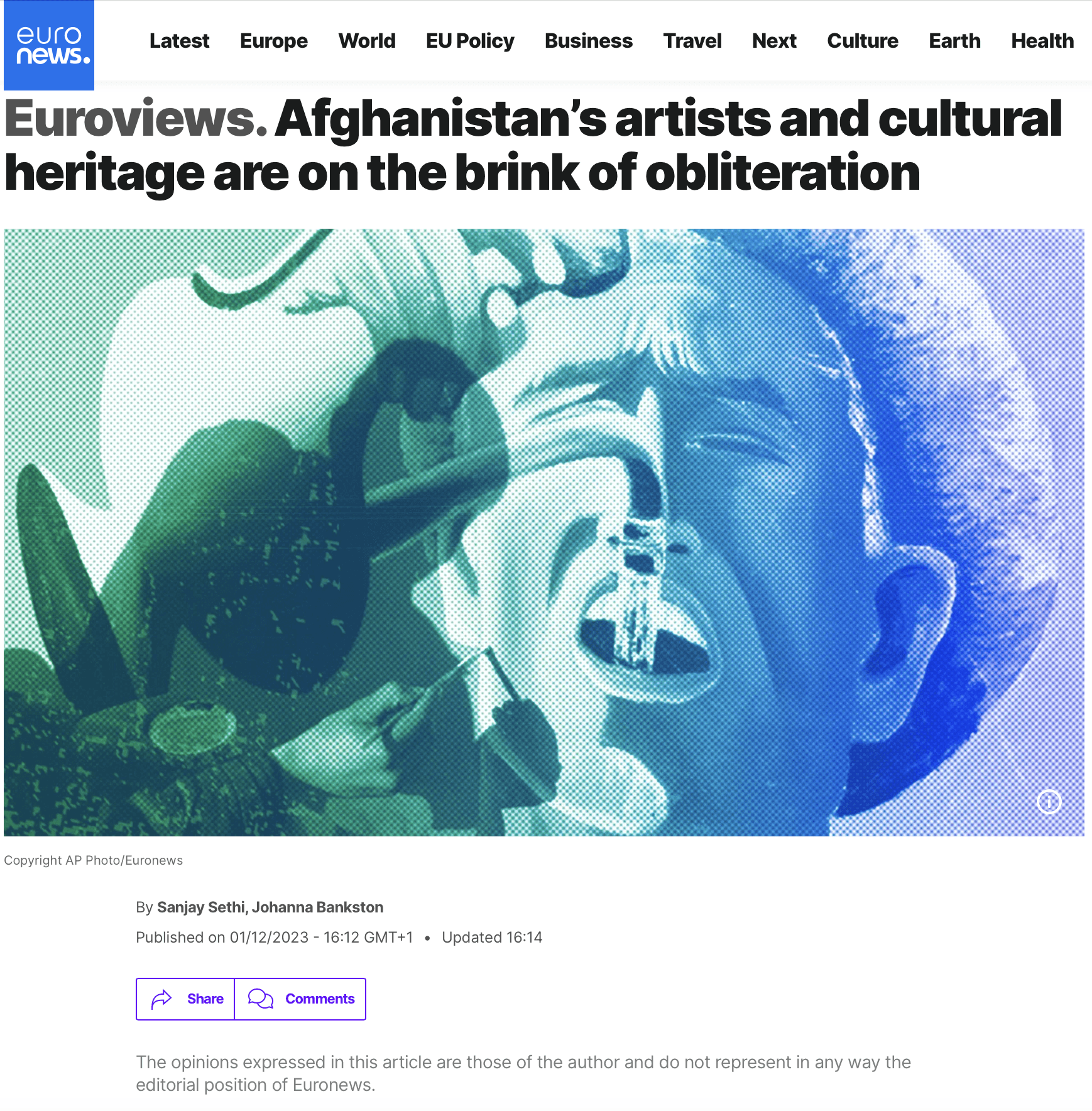 Afghanistan’s Artists and Cultural Heritage Are on the Brink of Obliteration published in Euronews, spotlighting the systematic dismantling of cultural life under Taliban rule.