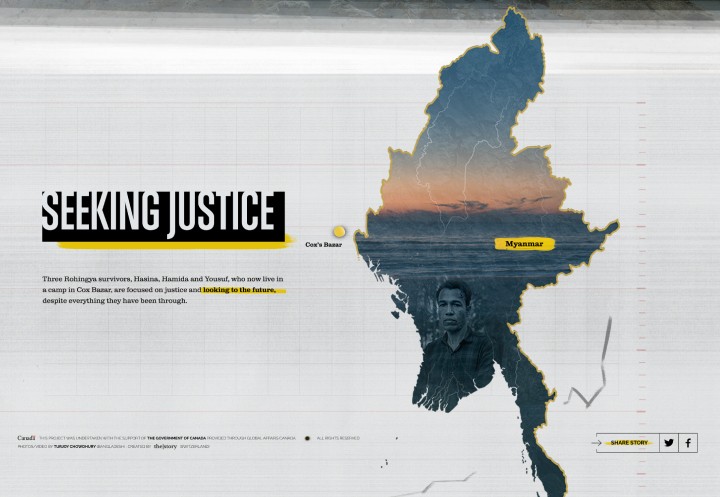Our team directed the interviewing, filming and photography of three survivors who are key to the justice process in a refugee camp in Bangladesh. We then conceptualised and developed an interactive microsite based on the photographic approach with light and shadow denoting the balance of suffering and hope.